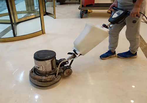 使用大理石翻新機(jī)配合專(zhuān)用研磨片對(duì)石材表面進(jìn)行深度打磨。
